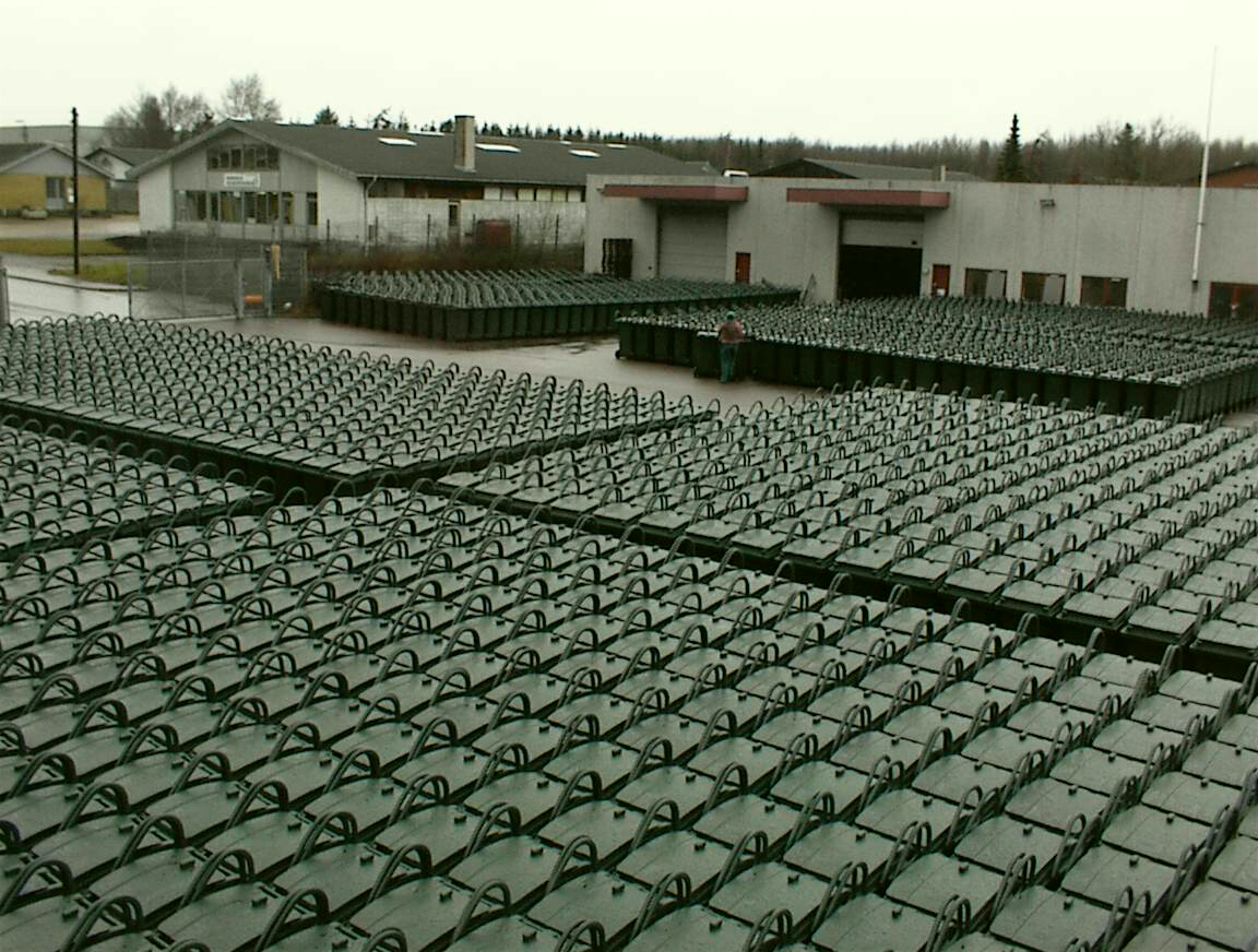 240 L beholdere monteret med skillevægge, dobbeltlåg og bøjlehåndtag - opstillet på rad og række så det ligner en romersk hær, der er parat til at modstå et angreb fra Asterix og hans gæve Gallere.